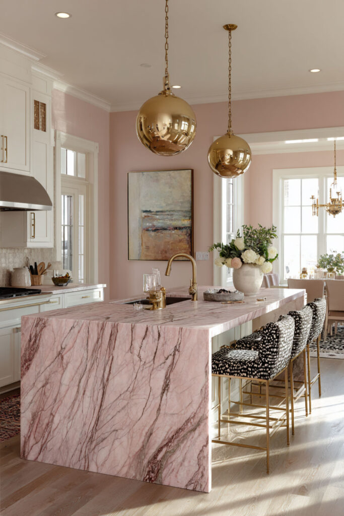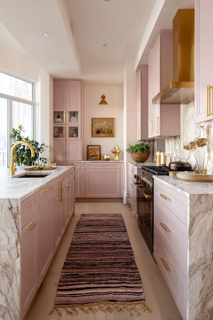 I recommend dusty pink kitchen cabinets with a honed gray marble or gray quartz backsplash. The honed finish keeps the surfaces soft and matte — no sharp reflections, just gentle light absorption. Brass hardware warms both the pink and the gray. The whole corner reads as calm, composed, and quietly striking. It’s the version of pink that surprises people — they expect sweetness and get sophistication instead.