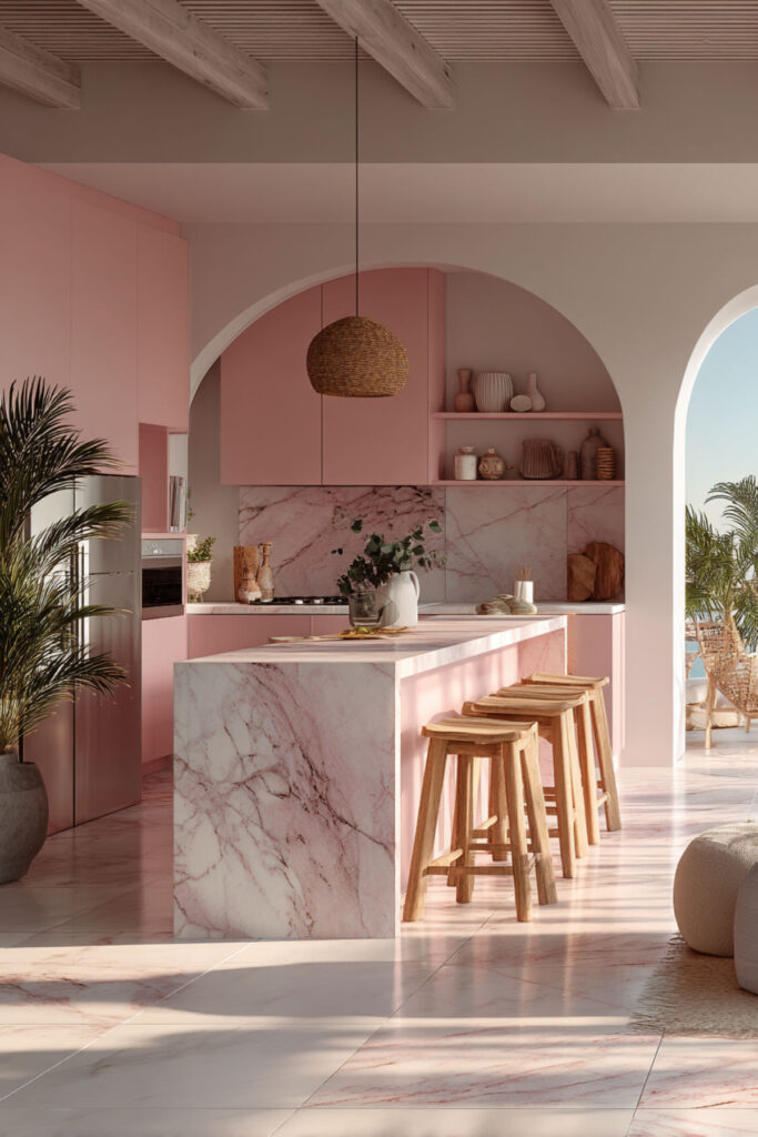 Light pink cabinets and white marble together create a palette that’s simultaneously cool and warm — the marble brings smooth, polished elegance, and the pink brings gentle, rosy warmth. In a kitchen with natural light, the marble reflects and the pink absorbs, creating a push-and-pull of light across the surfaces that keeps the room feeling dynamic and alive throughout the day.