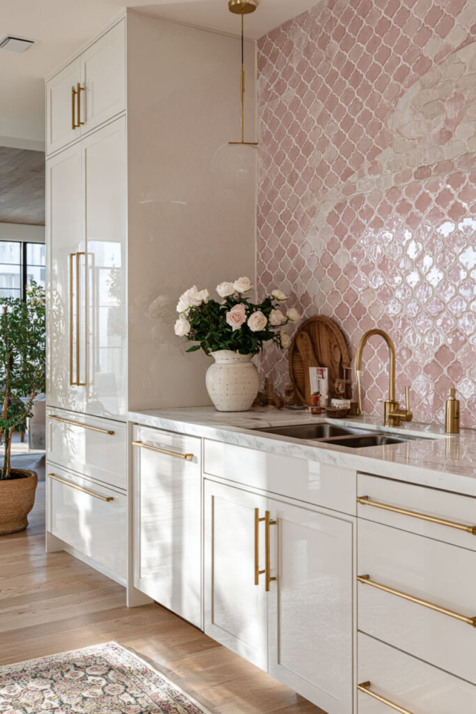 I recommend a pink and white tile backsplash in a zellige, subway, or small square format — alternating the two tones in a loose pattern or a gentle fade from pink at the top to white at the bottom. Against pink or white cabinets, the mixed tile adds depth and movement to the backsplash wall. Elegant pastel kitchen decor that uses tile as texture rather than pattern — soft, light-catching, and perfectly calm.