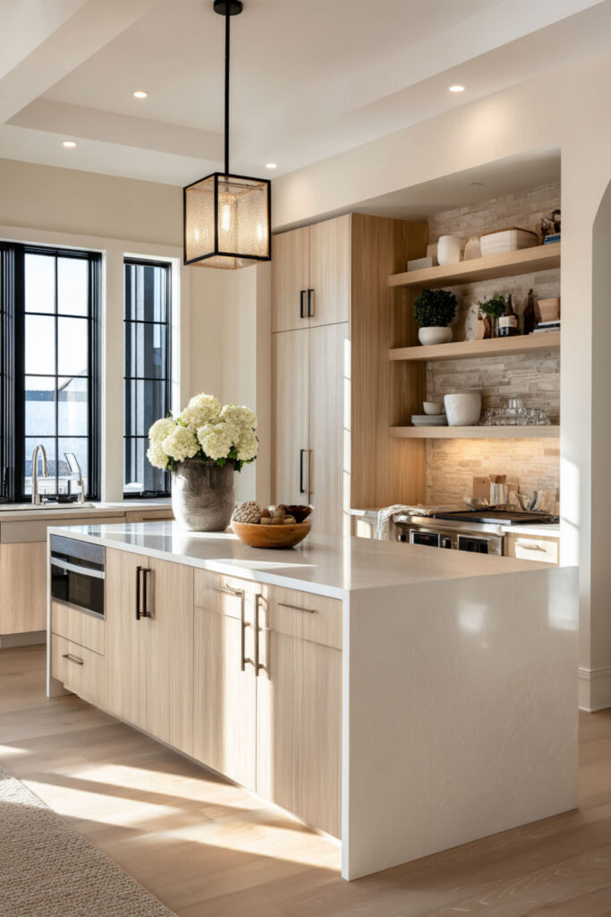 There’s something deeply calming about natural wood finish touches throughout your kitchen. The organic grain patterns and warm tones create a connection to nature that synthetic materials just can’t match. Replace a few cabinet fronts with natural wood, or add wooden open shelving for everyday dishes.