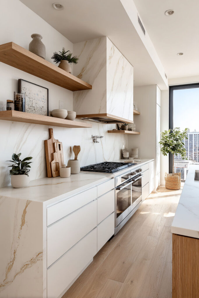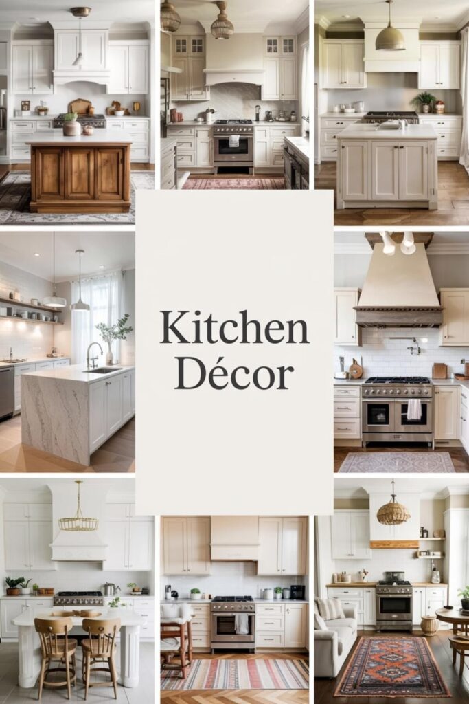 Avoid high contrast (black and white can feel aggressive when you’re already on edge). Instead, think tonal shifts – ivory to biscuit to warm gray. This palette works whether you prefer modern kitchen decor or something more traditional, and a white marble kitchen island
