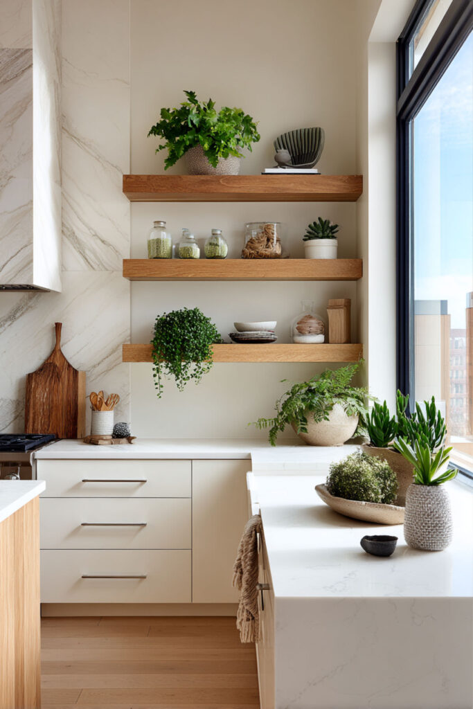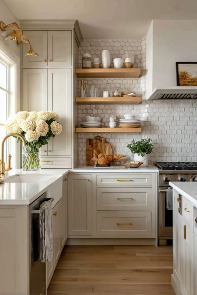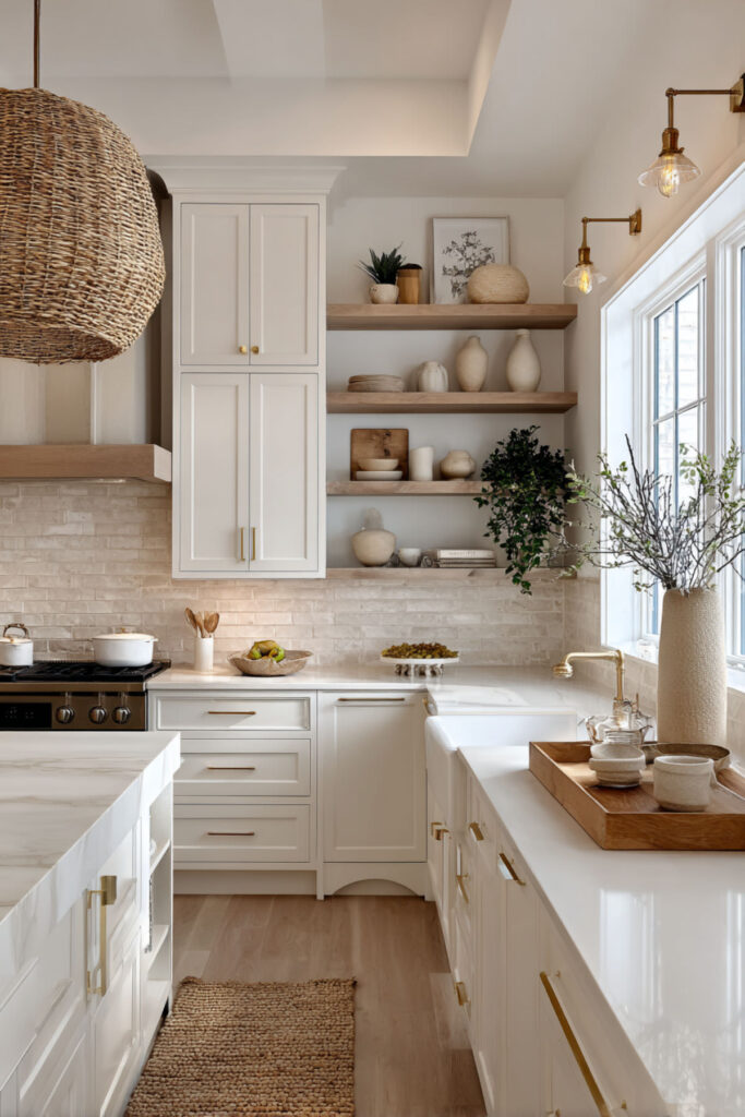 Wood cutting boards left on counters, brass hardware, woven baskets – all add warmth without clutter. The key is restraint; too many accessories create visual noise when you need peace.