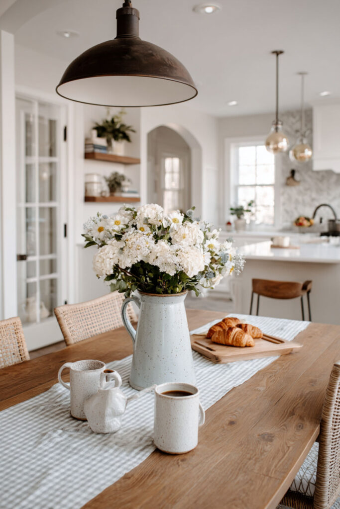 Your kitchen table decor should invite lingering, not rushing. A simple runner in natural fiber, maybe a low arrangement of succulents that won’t block conversation. Keep the table mostly clear – it becomes a landing pad for everything when energy is low.
