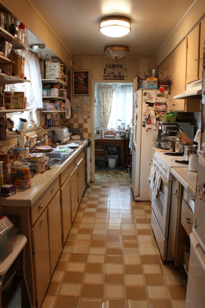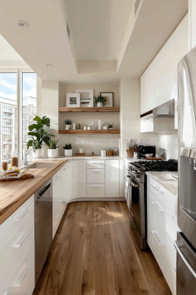 A galley kitchen layout minimizes the distance between essential points – perfect when every step requires effort. Everything happens in a straight line: fridge to counter to stove to sink. Install grab bars disguised as towel racks for discrete support during dizzy moments. The narrow space means counters on both sides for leaning support.