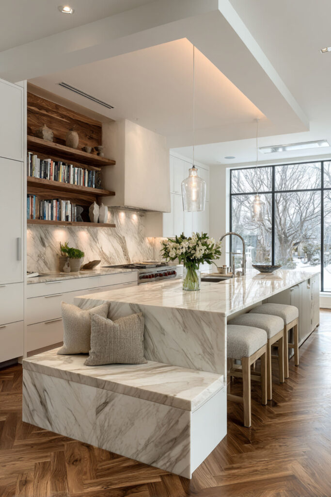 Your island with seating should accommodate sudden needs to sit. Choose stools with backs and arms – stability matters when balance fluctuates. The island height allows working while seated when standing feels impossible. Install a footrest rail for better circulation. Keep the island surface clear except for beautiful, calming elements.