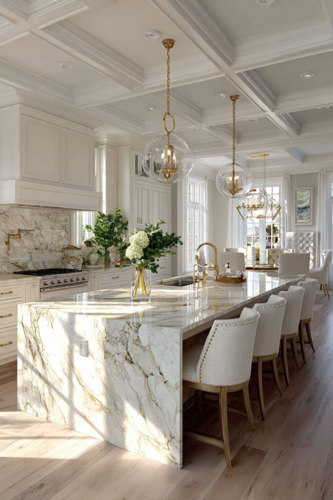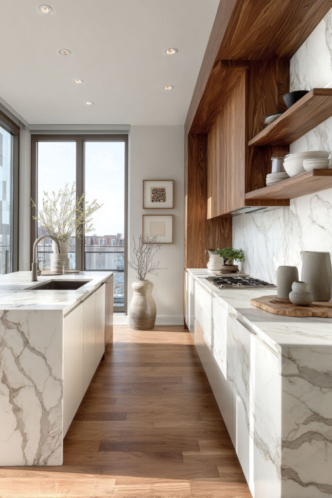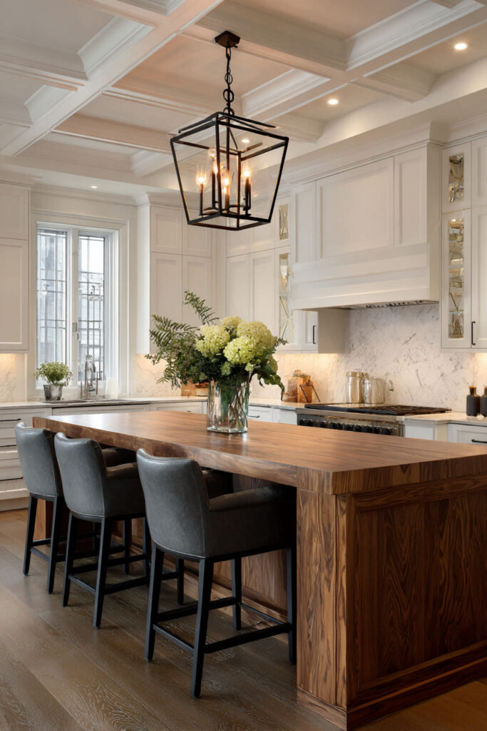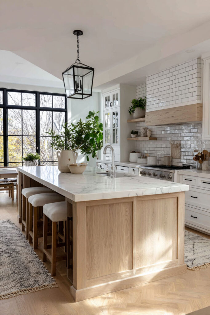 White marble counters and a wood island create one of the most elegant contrasts in kitchen design. The cool, veined marble on the perimeter and the warm, grainy wood on the island play off each other beautifully — one smooth and polished, one textured and honest. Together, they make a kitchen that feels both refined and welcoming. I recommend honed white marble for the perimeter counters and a thick-cut walnut or oak top for the island. The honed finish on the marble keeps things relaxed, while the wood top invites actual use — chopping, rolling, kneading. This white marble kitchen with wood island approach is for couples who want elegance they can actually live in.