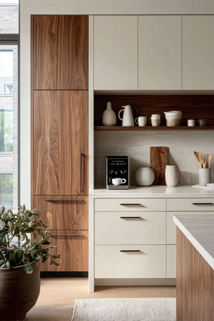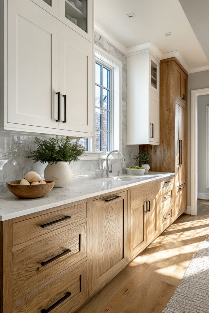 Instead of paint-on-paint two-tone, try the most organic version: white cabinets and natural wood cabinets in the same kitchen. White uppers and wood lowers, or white perimeter and wood island. The contrast between painted and natural surfaces creates visual interest without introducing a competing color — it’s all warmth, all texture. I recommend warm white on the upper cabinets and natural white oak on the lowers or island. The two materials complement each other the way a good partnership does — different strengths, shared warmth. Consistent brass hardware across both ties the two tones together. This two tone kitchen cabinets wood and white approach is one of the most naturally beautiful layouts you can create.