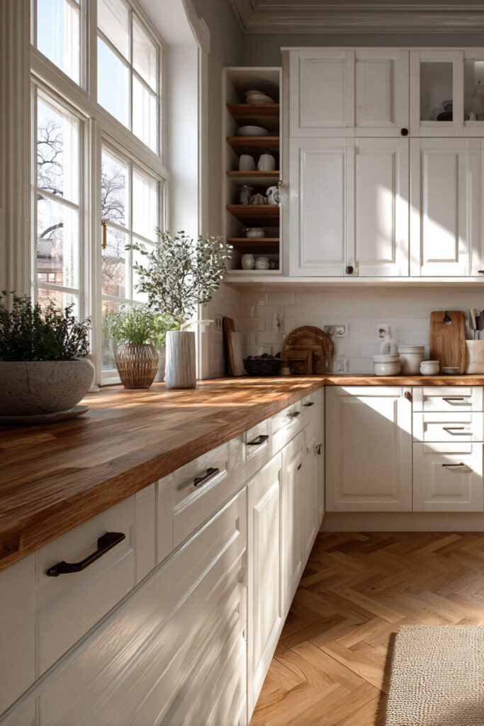 White shaker cabinets and butcher block counters is one of the most enduring, most reliable combinations in kitchen design. The clean lines of the shaker door provide structure, the warm white provides brightness, and the butcher block brings the warmth, texture, and functionality that marble or quartz sometimes lack. The counter is a work surface that invites you to use it — chop, knead, roll, assemble. I strongly recommend a thick-cut maple butcher block, at least an inch and a half. Oil it regularly, and it develops a gorgeous patina that tells the story of every meal you’ve made together. This white kitchen with wood countertops approach is for couples who actually cook — who see the kitchen as a place of shared labor and shared pleasure.