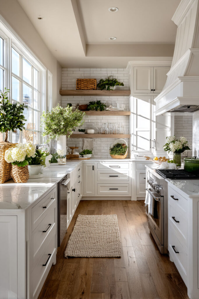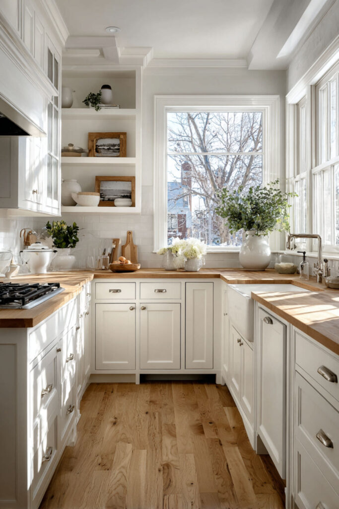 Galley kitchens are inherently intimate — two people working side by side in a narrow space, passing things back and forth, bumping shoulders. In warm white with open wood shelving replacing upper cabinets on one side, a galley becomes less of a corridor and more of a cozy, shared workspace. The wood shelves keep the upper portion airy and warm, while the white cabinets below keep everything bright. I recommend natural oak floating shelves on one wall and white shaker uppers on the opposite wall. The asymmetry adds character, and the open shelves give you room to display the things you use every day — your matching mugs, the olive oil, a wooden bowl. This galley style kitchen in warm white and wood is proof that small kitchens can be the most romantic rooms in the house.