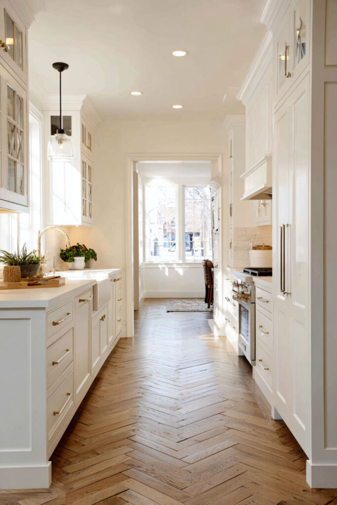 The floor is the largest surface in any kitchen, and a herringbone wood floor beneath warm white cabinets creates a room that feels layered, warm, and architecturally interesting. The herringbone pattern adds movement and visual energy underfoot without any competing pattern on the walls or cabinets — the floor does the talking, and the white kitchen above provides the quiet backdrop. I recommend a light to medium oak herringbone floor in a matte finish. The warm tones rise up and echo through the room, making the white cabinets above feel warmer by association. It’s the kind of detail that gives a kitchen genuine character. It reminds me of those gorgeous renovated kitchens in pre-war apartments on the Upper West Side — where the bones of the building set the tone for everything.