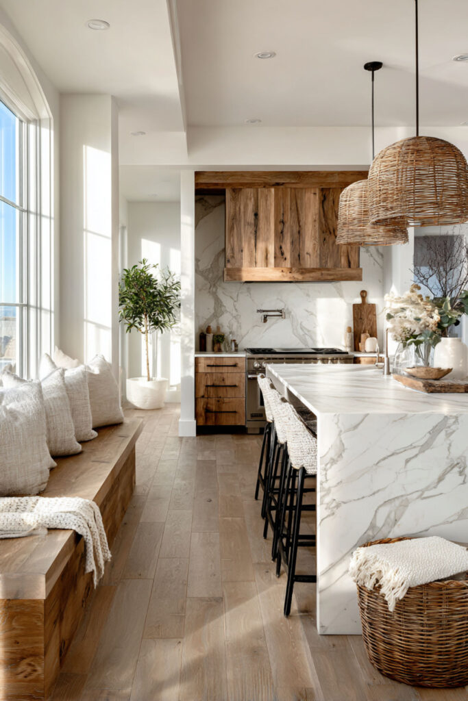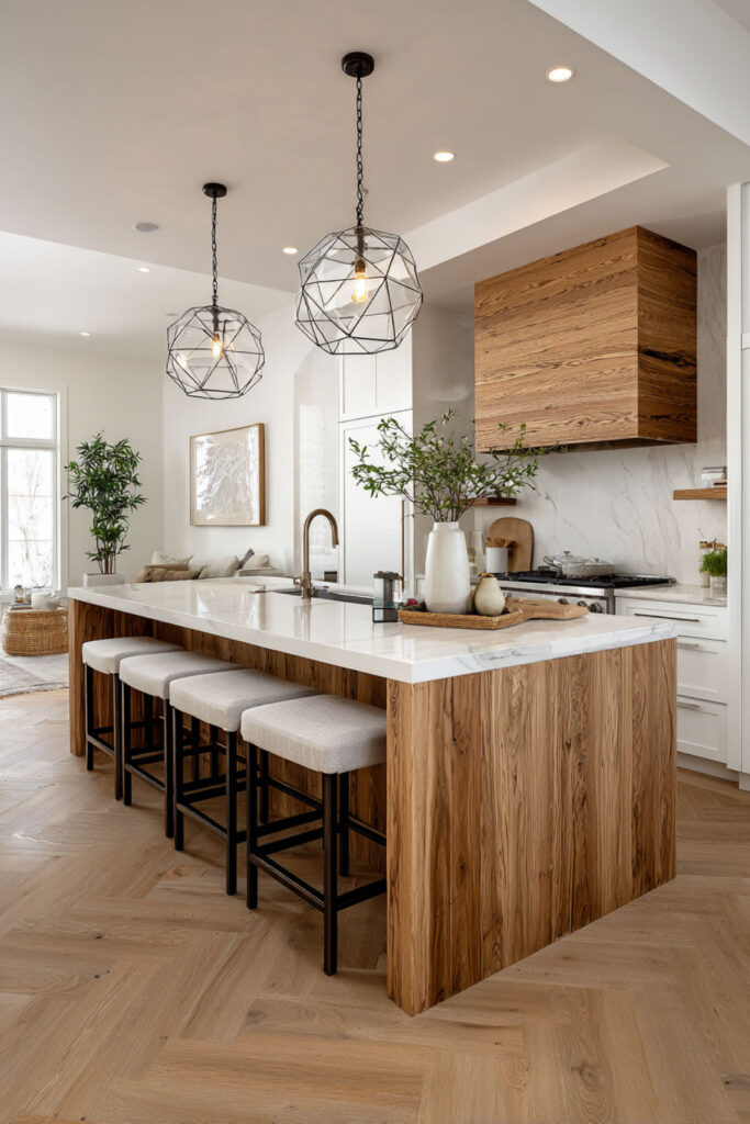 Sometimes one is enough. A single oversized pendant light above the island — large, sculptural, warm-toned — creates a focal point that defines the whole kitchen. It says: this is the center. This is where we gather. In a warm white and wood kitchen, one brass or woven pendant makes more impact than three smaller ones because it becomes the room’s crown jewel. I recommend an oversized woven rattan drum pendant or a large brass lantern, hung at a height that illuminates the island without obstructing sightlines across the kitchen. The scale of one large pendant creates drama that multiple smaller lights can’t match. It’s the kind of lighting choice that makes people say, “I love that,” every time they walk in.