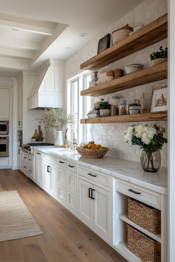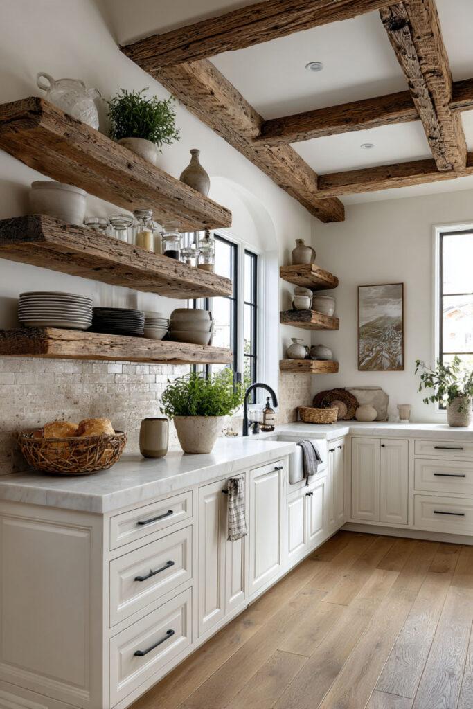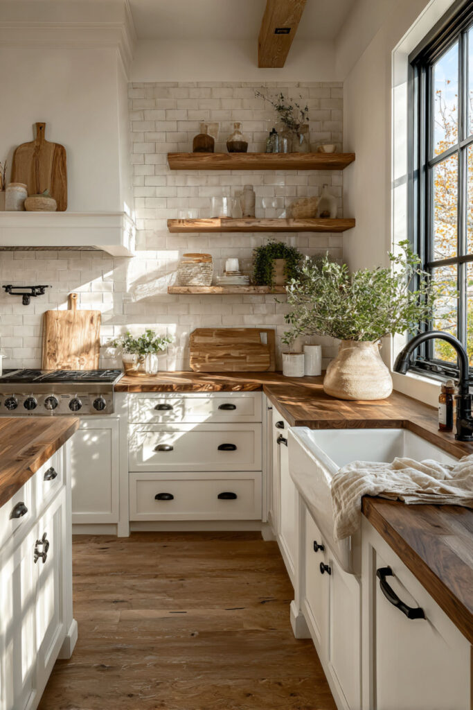 Farmhouse style has evolved — gone are the chevron signs and mason jars, replaced by reclaimed wood accents, handmade ceramics, and a general sense of warmth without theme. A white farmhouse kitchen with reclaimed wood — a reclaimed beam above the range, a reclaimed wood island, or salvaged wood shelving — brings character that new materials can’t replicate. The imperfections in reclaimed wood are the whole point. I recommend a reclaimed wood accent beam over the range or reclaimed oak open shelves flanking the hood. Against warm white cabinets, the aged wood adds instant soul. A fireclay farmhouse sink, an aged brass faucet, and a few linen tea towels complete the look. This white farmhouse kitchen approach has this gorgeous quality: it feels like a kitchen that’s been collecting stories for decades.