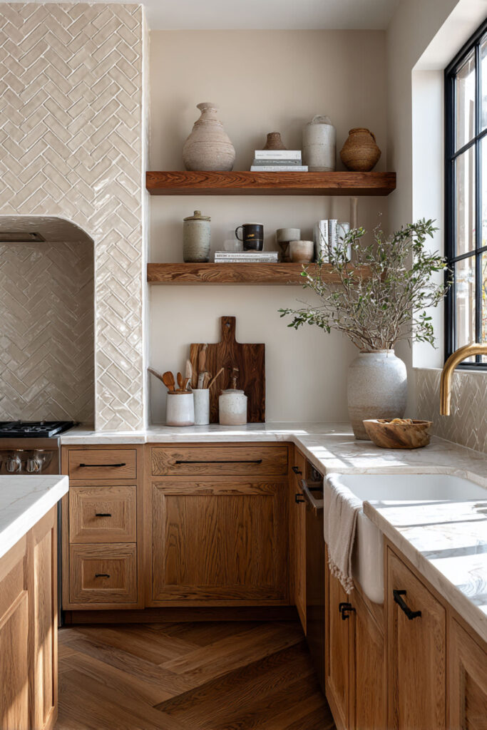 In a warm white and wood kitchen, the backsplash is where you get to add texture without adding color. A white subway tile in a brick pattern is classic and clean. White zellige tile adds handmade variation and a subtle shimmer. White herringbone tile adds pattern and movement. Each option supports the warm white-and-wood palette while adding its own character. I recommend white zellige tiles if you want warmth and texture — the handmade irregularities catch light differently throughout the day and give the backsplash a living quality. For something more structured, a white herringbone backsplash adds a geometric energy that feels contemporary. Any of these white kitchen backsplash ideas keeps the room feeling cohesive while giving the walls something interesting to say.