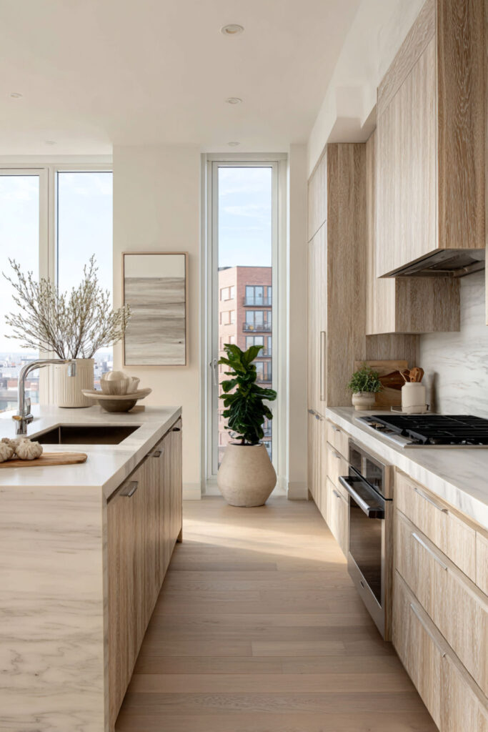 White oak has become the defining wood of 2026 kitchen design — and for good reason. A modern white kitchen with white oak cabinets (either as a full run or mixed with painted white cabinets) creates a space that’s clean, contemporary, and deeply warm at the same time. The visible grain of the white oak provides all the visual interest you need, and the golden-grey tones read as neutral enough to work with virtually any countertop or backsplash. I recommend white oak slab-front cabinets with integrated pulls for the most streamlined modern look. Pair with a white quartz counter and a simple white tile backsplash. The wood grain becomes the primary design element, and the warm white surroundings let it shine. This white oak kitchen approach proves that modern doesn’t have to mean cold.