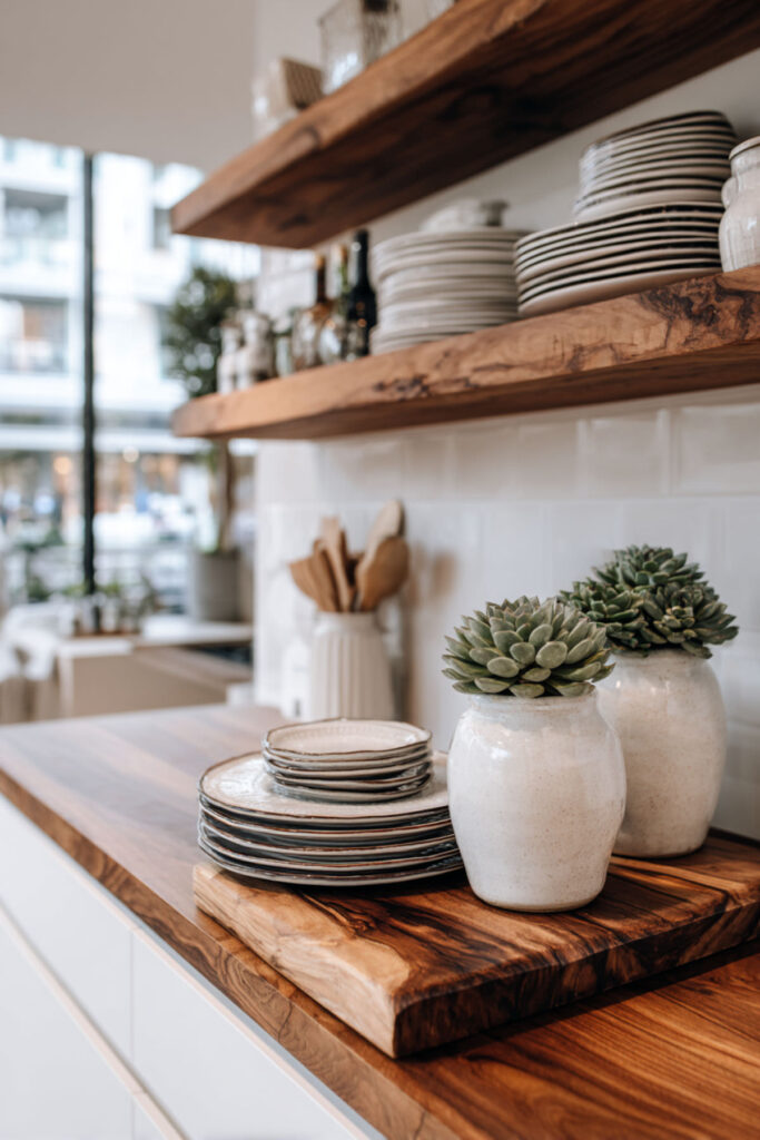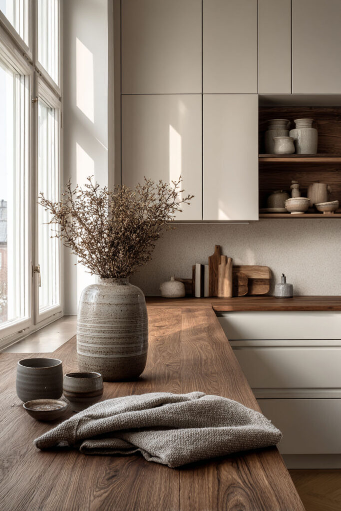 A few green accents in a warm white and wood kitchen bring the only color that actually makes the room feel more natural. A trailing pothos on the open shelf, herbs growing on the windowsill, a small green ceramic vase on the island. The green doesn’t compete with the palette — it completes it, the way a garden completes a home. I recommend a small herb garden on the counter or windowsill — basil, rosemary, thyme in simple ceramic pots. The living green against the warm white and natural wood creates this fresh, breathing quality that makes the kitchen feel alive. This white and green kitchen detail is the simplest, most beautiful accent in the organic design toolkit.