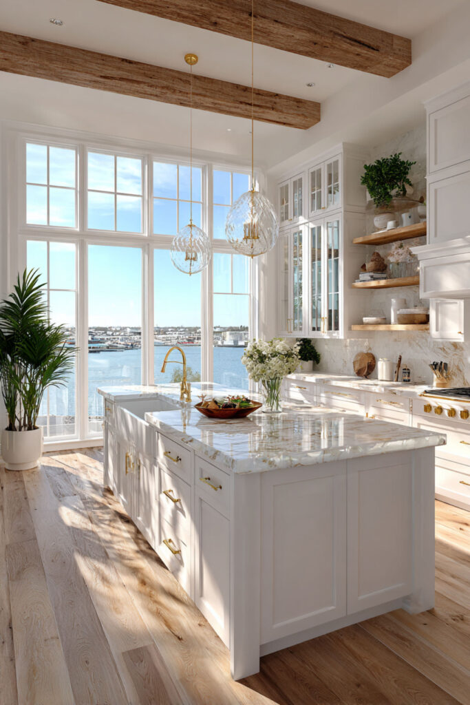 Let’s close with the complete vision. A warm white and wood dream kitchen: creamy white shaker cabinets with brushed brass hardware, a natural white oak island with a thick marble top, open oak shelving styled with white ceramics and a small herb garden, a zellige tile backsplash in warm white, wide-plank oak herringbone floors, a deep fireclay farmhouse sink with a brass bridge faucet, two woven pendant lights casting golden light above the island, and a small round wooden table pulled close for breakfast. Every surface is warm. Every detail supports the act of being together in the same room. Would you build the full dream? I think for married women designing shared ritual spaces, this kitchen is more than a renovation. It’s a promise — that the everyday moments matter, that the kitchen holds your best stories, and that the room you share most often should be the most beautiful room in the house.