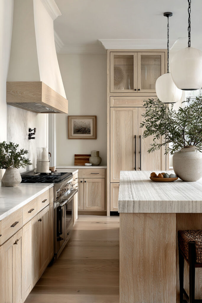 This is the combination that defines the warm white and wood kitchen. Warm white cabinets — creamy, not stark, with golden or butter undertones — on the perimeter, and a natural white oak island in the center. The oak brings grain, warmth, and a sense of honesty that paint can’t replicate. The island becomes the room’s anchor — the spot where you both gravitate, whether it’s morning coffee or evening wine. I really recommend a white oak island with a clear matte finish that preserves the natural grain. The golden tones against the warm white create a palette that feels like linen and honey — soft, warm, and endlessly inviting. This white and wood kitchen combination is the foundation of everything that follows.